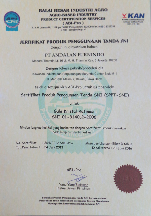 Awarded SNI certificate issued by Agro-Based Industry Product Certification Services (ABI-Pro)